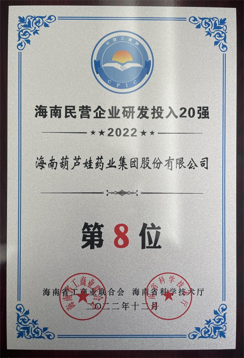 12月23日,2022海南民营企业50强和研发投入20强发布会在海口举行。会上发布了“2022海南民营企业50强”“2022海南民营企业研发投入20强”榜单和分析报告。豪门国际药业再次荣登两榜,在海南民营企业50强榜单中位列第25位,较去年上升8位,这也是公司连续三年登榜;在海南民营企业研发投入20强中位列第8位,较去年上升7位。